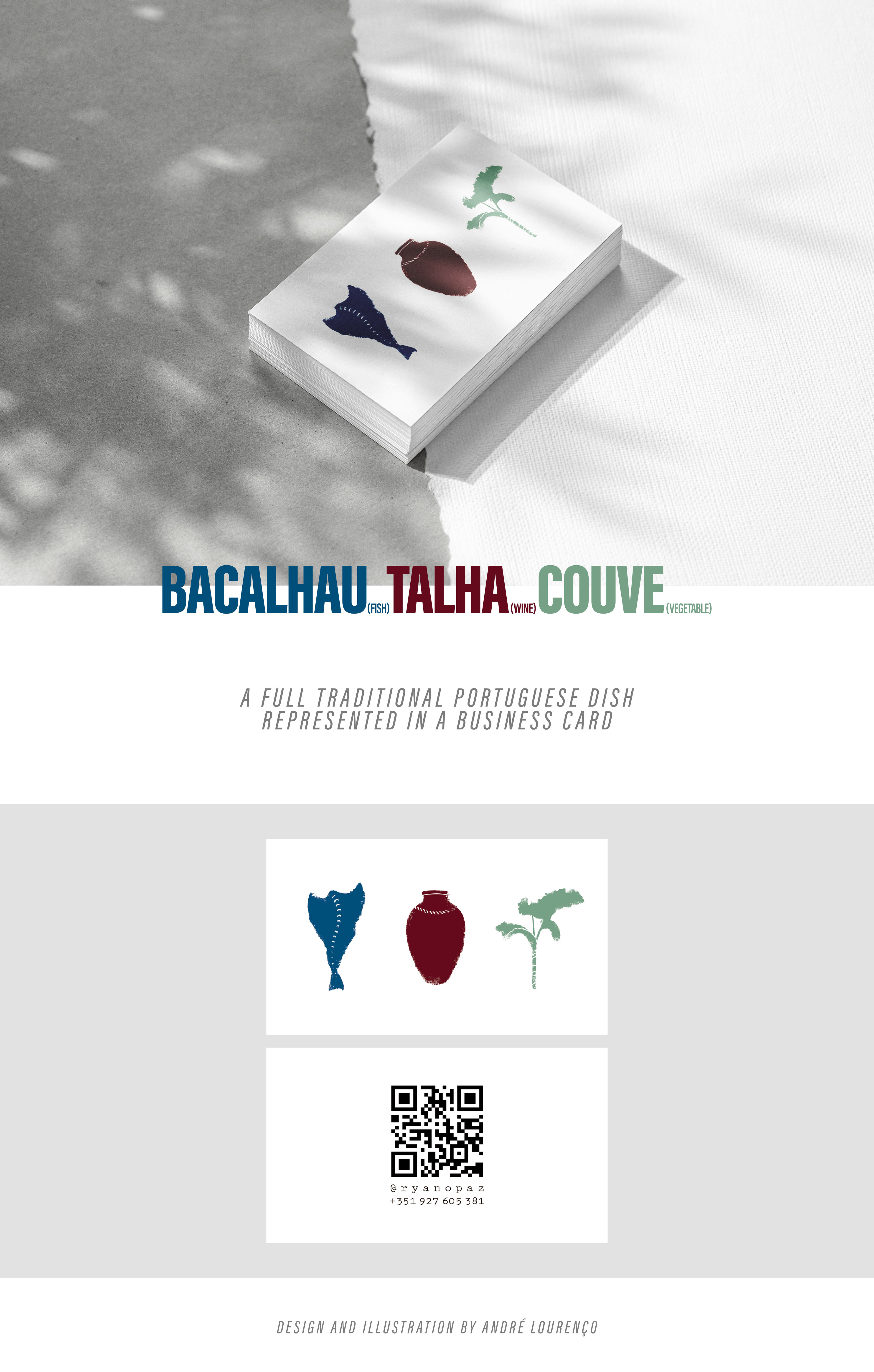 Portuguese tradition is at the core of this project. The three figures represented on the business card consist of fundamental elements of the traditional Portuguese cuisine. The organic shapes as well as the distressed edges of the Cod, Talha and Cabage were incorporated in order to evoke a sense of tradition associated with this dish.